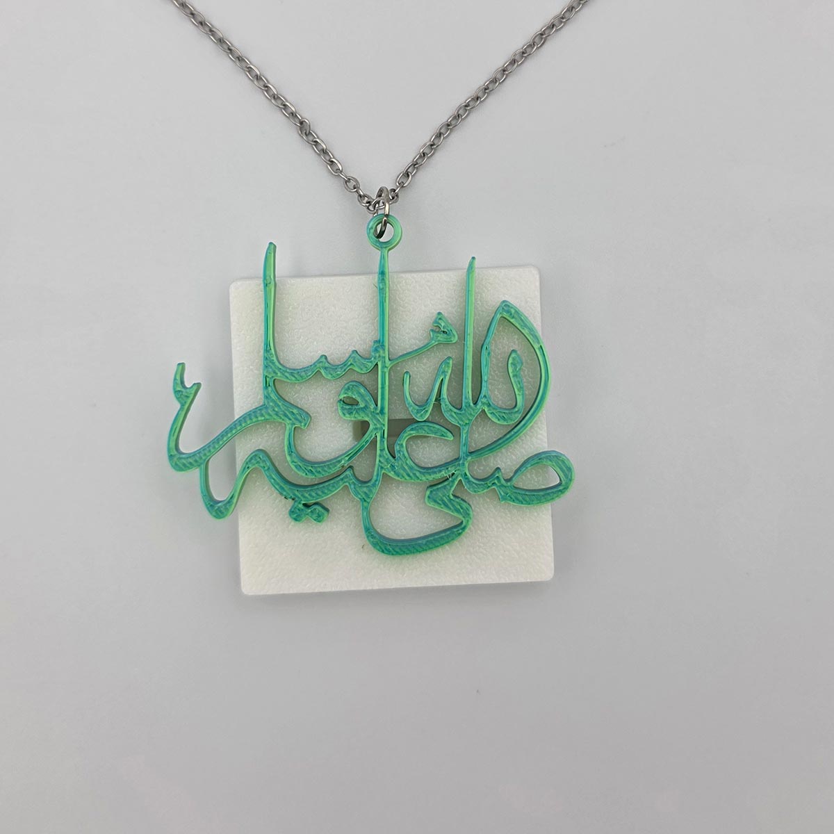 A 3D printed Darood Shareef hanger for your car mirror, featuring “Sallallahu Alayhi Wasallam” calligraphy and a chain for hanging.
