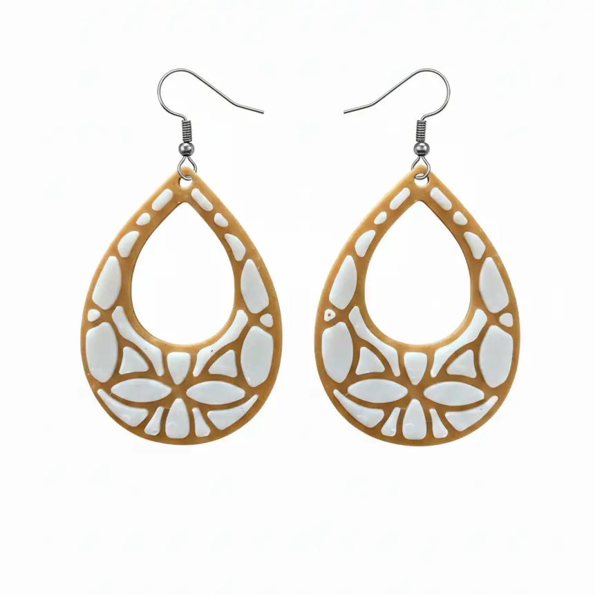 - A stunning pair of lightweight dangle earrings with a modern, swirling pattern. A bold statement piece that's comfortable enough for everyday wear.